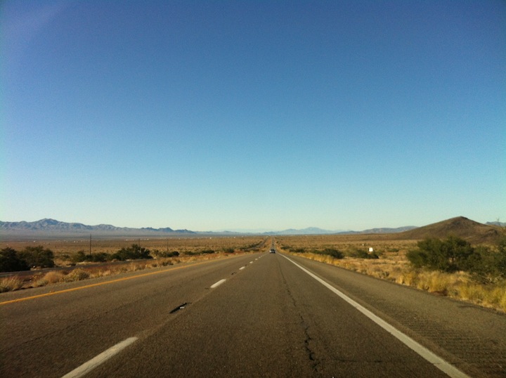 The drive from Las Vegas to Los Angeles is filled with douche bags and yellow dry mountains. Everything is yellow, gold and dusty. You see clouds billowing up to the sky, way off in the distance in the desert; someone driving through the middle of nowhere or a bunch of guys burying bodies all at once?